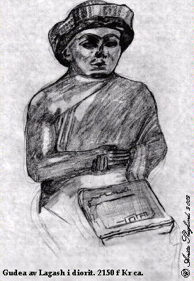 I så gott som varje stad fann man dessa överbevuxna kullar (tell) som visade sig vara tempeltorn, så kallade ziqqurat. I Uruk – kallad Erech i Bibeln – står en ziqqurat som förmodas vara äldre än 5000 år. De var byggda i tre stora block på höjden, med det allra heligaste – cellan – på det platta taket, där det antagligen stått en staty av guden vid ”altaret”. Ziqquraten i Uruk kallas det ”vita templet” för sina vitslammade tegelfasader. (…) låt oss slå tegel” som det står i Bibeln. På fasaden finns dessa inbyggda platta pelare som kallas pilaster. Till templen hörde statyer av gudar i varierande storlek. Hantverkarna/konstnärerna var mycket skickliga, deras arbeten i brons, sten, lapis lazuli och snäckor är mycket vackra. Ett vackert arbete är skulpturen i diorit av Gudea från ca 2150 f. Kr. Gudea var härskare av staden Lagash. Diorit är en mycket hård sten att bearbeta, men å andra sidan får den en mycket fin glans och lyster. Till skillnad mot de statiska gudafigurerna har Gudeas figur antydan av muskelspänning och viss styrka. Mytologins gudar