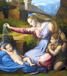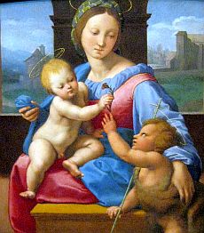 Sedan hittade jag en utställning som visade Raphaels Madonnor. Det var ju ett måste. Jag visar tre av dem här nere. Till vänster finns "Madonna Aldobrandini". Den heter så för att bilden fanns under trehundra år i familjen Aldobrandinis ägor. Sen 1865 finns den i National Gallery i London.