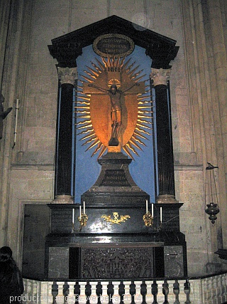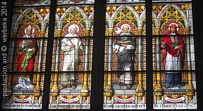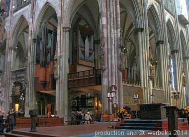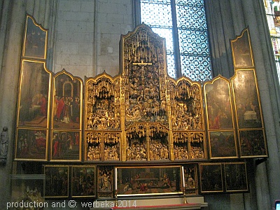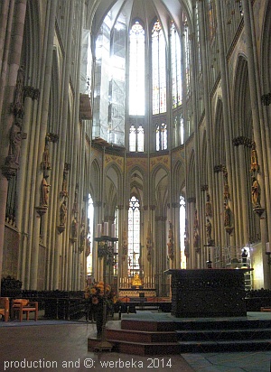Im Bild unten rechts sehen wir den Chor mit dem goldglänzenden Dreikönigenschrein über dem Hochaltar im Hintergrund. Die Altarplatte ist aus einem Stück schwarzem Marmor und damit der größte Stein der Kirche. Der Altar wurde schon 1322 geweiht.