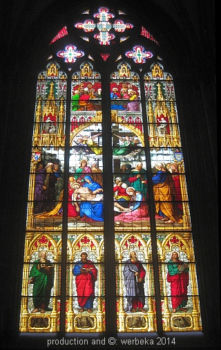 Über dem Altar sieht man das sogenannte "Ältere Bibelfenster". Es ist das älteste Glasgemälde des Domes und wurde um 1260 eingesetzt. Damals war es das einizige mehrfarbige im Chorumgang, denn alle anderen Fenster waren nur mit einfärbigen Pflanzenmustern bemalt. Flankiert wird das Bibelfenster heute vom Dreikönigenfenster links, beziehungsweise vom Petrus- und Maternusfenster an der rechten Seite. Beide stammen jedoch aus dem 14. Jahrhundert.