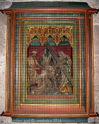 Persönlich haben mich die vielen Altäre angesprochen - jeder einzelne davon ein herausragendes Kunstwerk. Im nördlichen Seitenschiff finden wir den Klarenaltar aus dem 14. Jahrhundert. Auf den Außenseiten der Flügel sieht man zwölf Heilige - aber wichtiger ist wohl, dass dies die ältesten erhaltenen Leinwandgemälde sind! Der geöffnete Altar (im Bild links) zeigt vierundzwanzig Szenen aus dem Leben Jesu.