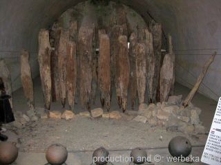 Am Rückweg vom Aussichtspunkt passiert man drei Zellen, in denen Szenen aus dem frühen 19. Jahrhundert nachgebildet sind, nämlich eine Schmiede, eine Küche und eine Bäckerei. In der nächsten Kammer stehen etliche, teilweise verwitterte Holzpfähle. Das scheint nichts Besonderes zu sein. Erst wenn man weiß, dass diese Pfähle schon bald tausend Jahre alt sind, bringt man ihnen ein wenig mehr Achtung entgegen.