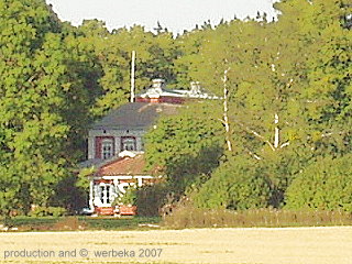 | Huvudbyggnaden, på somliga ställen till och med kallad "slott" (vilket dock är att ta i), uppfördes 1656 på uppdrag av Erik Oxenstierna. Det är idag omgärdat av träd, som ger fri sikt egentligen bara från södra, det vill säga gårdssidan. Eftersom jag inte är någon paparazzo, nöjer jag mig med en bild från stora vägen mot Tidö-Lindö mot det som syns av byggnaden. Där ser man också en av de två fristående flygelbygganderna, som byggdes samtidigt med slottet. Det finns två flyglar till, som dock kom till först i mitten på 1700-talet. Arkitekten bakom verket var förmodligen Jean de la Vallé. Förmodandet grundas bland annat på att huset är likt Riddarhuset i Stockholm.