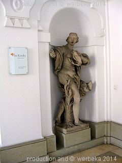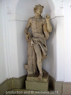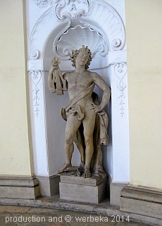 Aber auch im Inneren ist das Palais den einen oder anderen Blick wert. Schon allein die Skulpturen in dafür vorhergesehenen Nischen fangen die Aufmerksamkeit des Besuchers. Sie stammen, wie vermutlich auch diejenigen an der Außenseite, von Joseph Kracker. Es ist egal, ob es dabei um den Lüstling Pan geht, mit der nach ihm benannten Flöte, oder um Syrinx (ein anderer Name der Panflöte ist ja eben Syrinx), die vor ihm flieht.