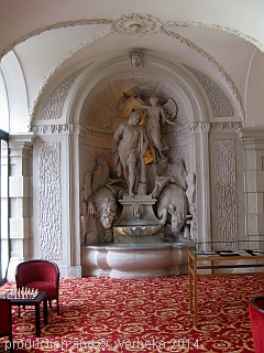 Das Haus allein ist sehenswert. Eine erste Augenweide ist der Brunnen, der vis-a-vis vom Haupteingang zu bewundern ist. Wir sehen Herakles, mit Keule bewaffnet, umgeben von Löwe und Eber, die zwei seine zwölf Großtaten symbolisieren. Seitlich über ihm schwebt ein Engel, der ihm gerade einen goldenen Lorbeerkranz aufsetzt, zum Zeichen von ewigem Ruhm.